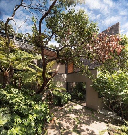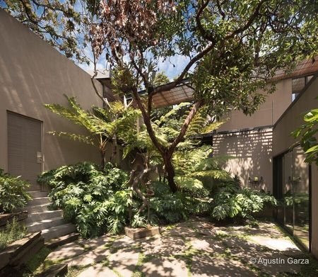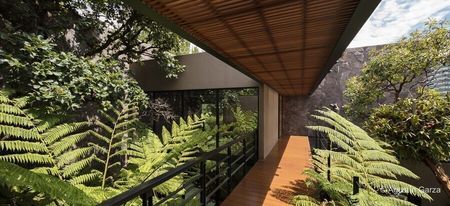En la Planta Baja se localizan los accesos principales y de servicio, dos áreas de estacionamiento, una cubierta para 5 autos y otra a descubierto para 2, una pequeña bodega para herramientas o papelería, un puente de acceso, precioso espejo de agua, vestíbulo principal, un generoso estudio con medio baño y dos terrazas, una cubierta y otra a descubierto. Ahi mismo está la escalera principal que va hacia el 1er nivel.