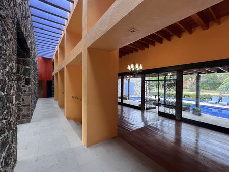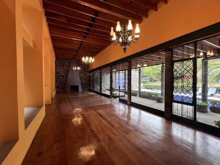El interior se distingue por sus techos altos, vigas y pisos de madera que aportan calidez y elegancia a cada espacio. La sala principal es un gran salón abierto que se conecta directamente con la terraza que rodea la alberca con calefacción, ideal para el entretenimiento y el disfrute familiar.